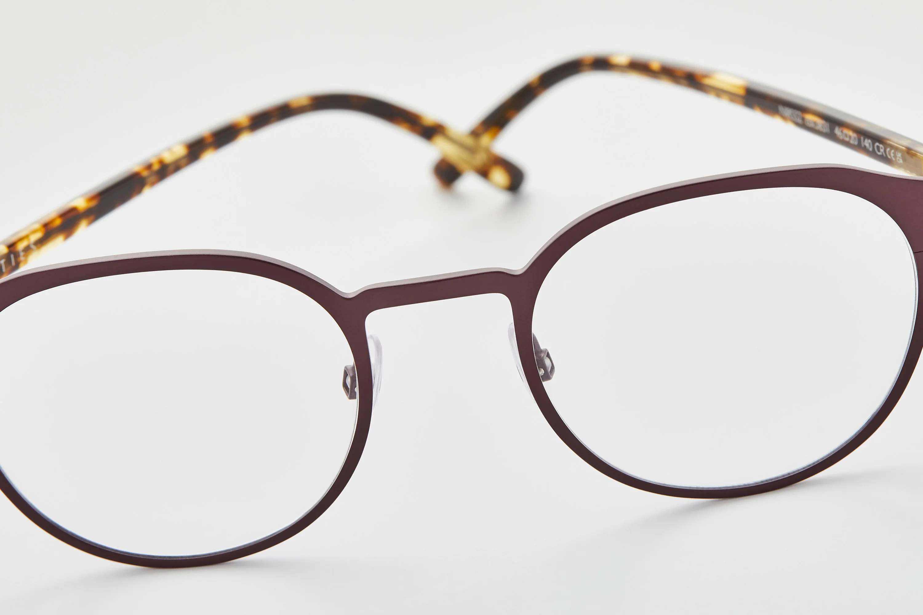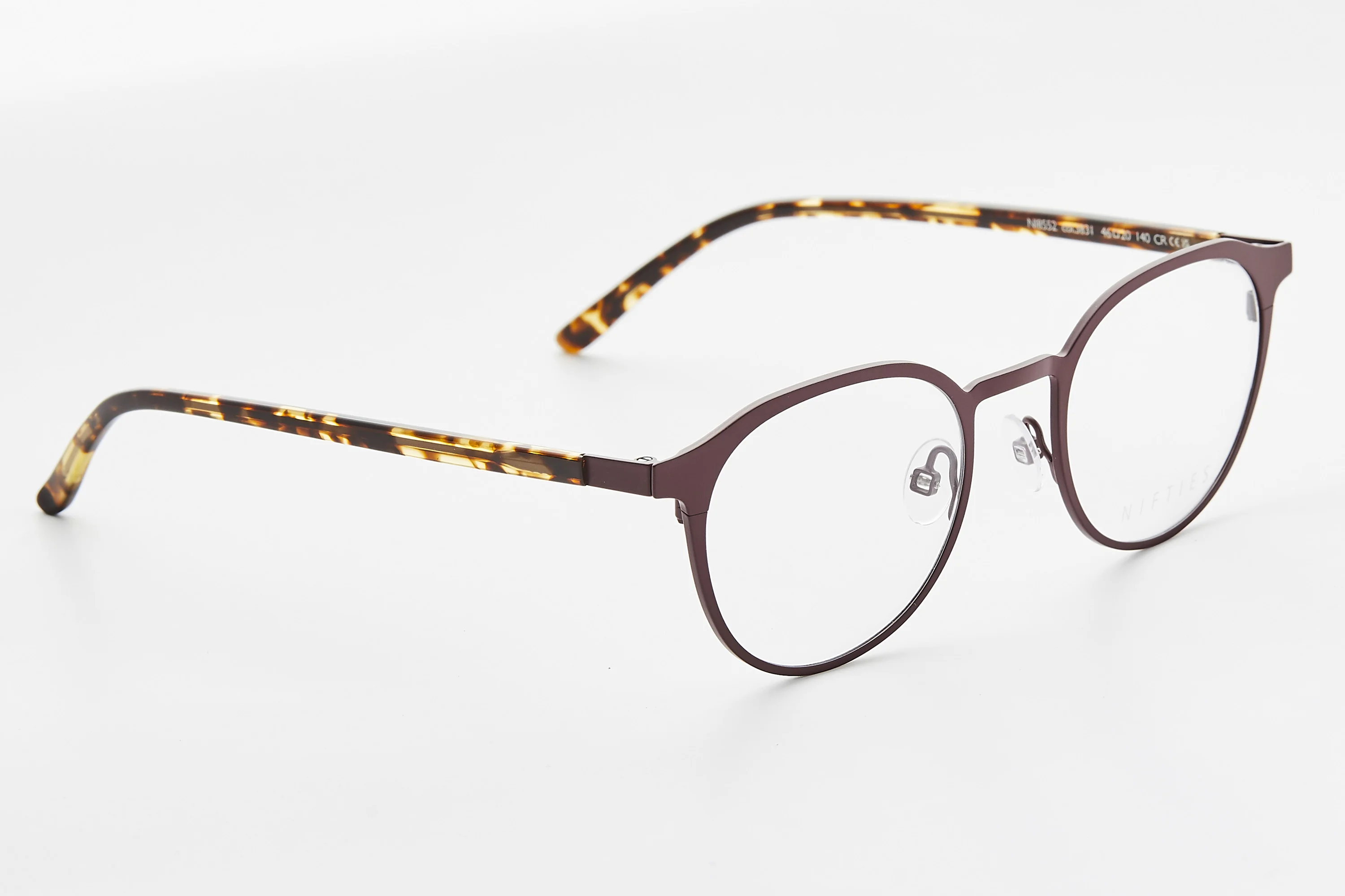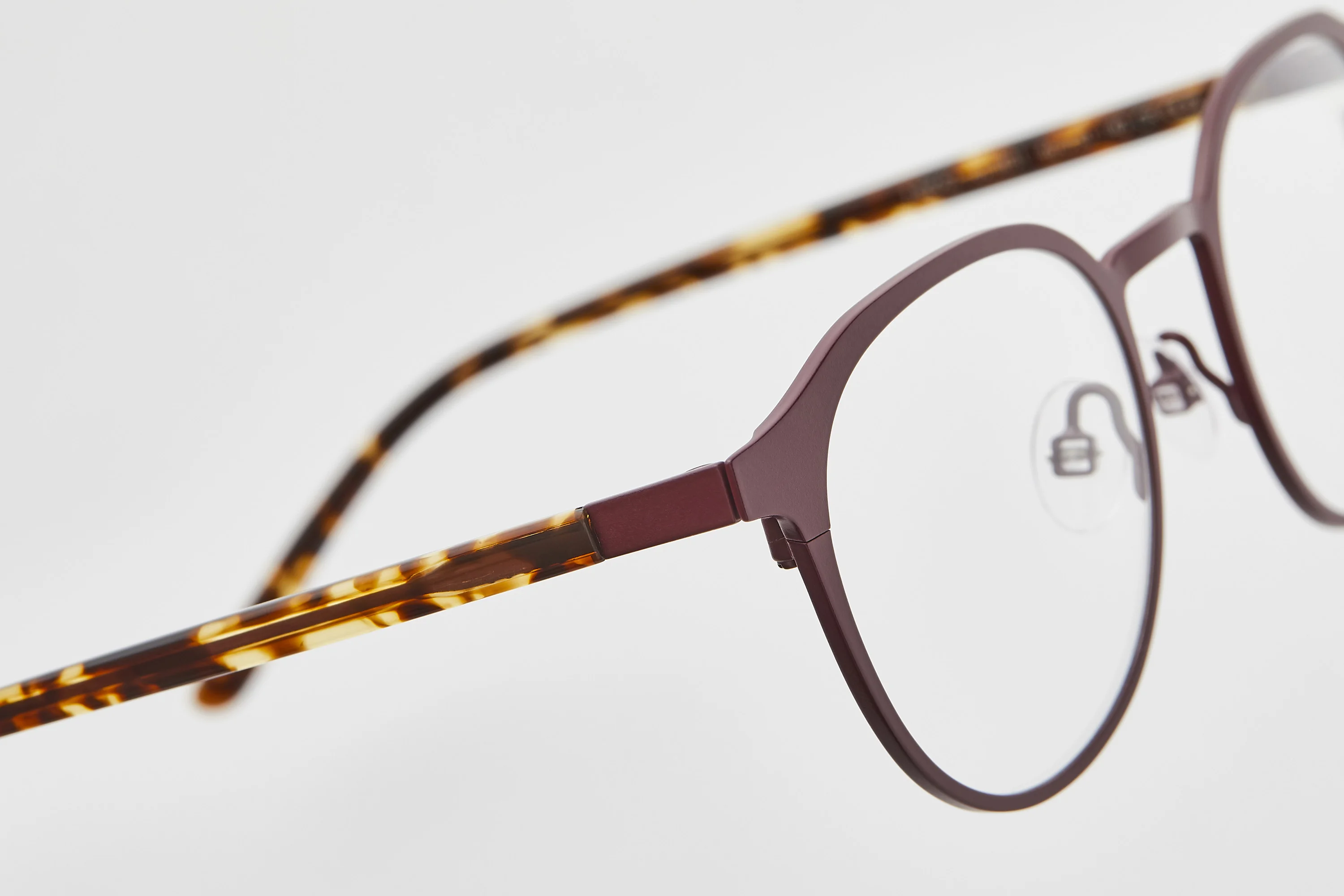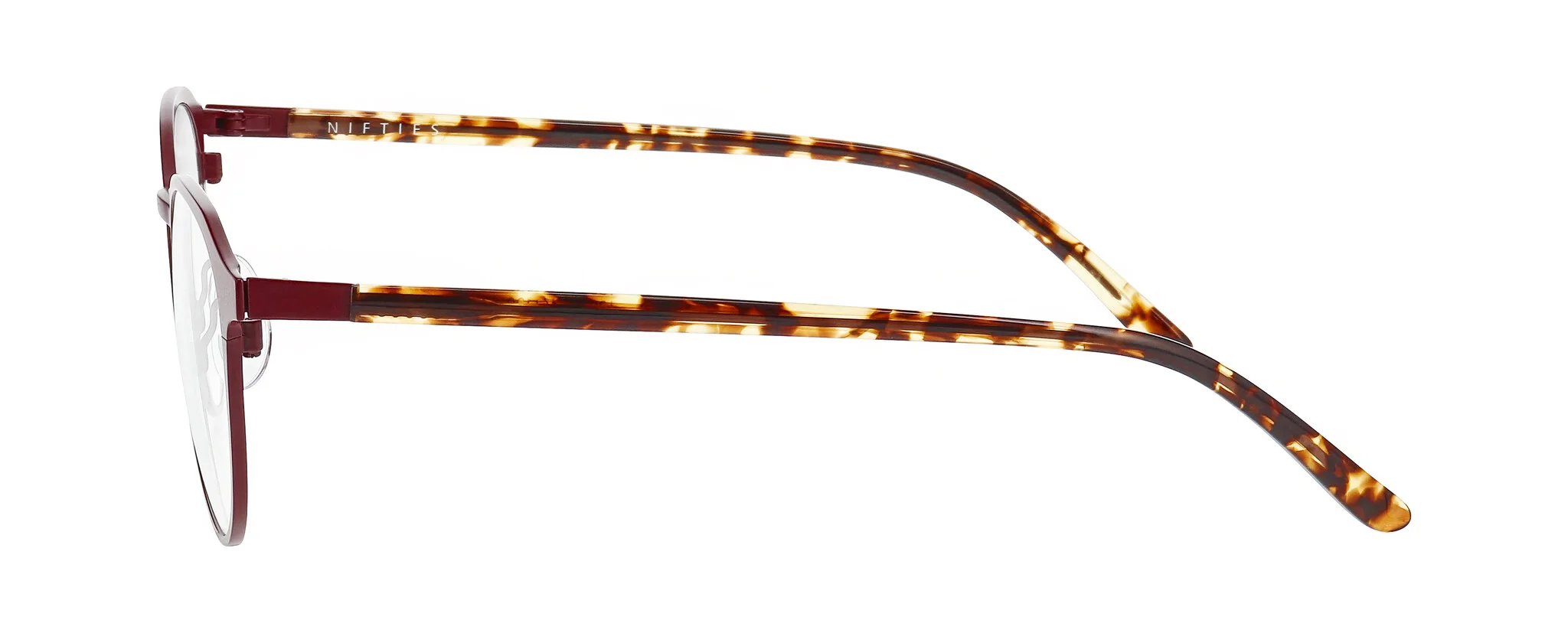 A flat sheet metal offered in matte finishes with a vintage inspired acetate tort temple. Retro touches combine harmoniously with a look of technical invention; demonstrated by the innovative closure of the hinge. Precision engineering by Nifties.